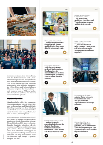 43Unsere Beziehung wird funktionieren, wenn %u2026 %u2026 dir Innovation, Ambition, Exzellenz und Verantwortung genauso wichtig sind wie mir.Wenn ich ein Song w%u00e4re, dann w%u00e4re ich %u2026 %u2026 %u201eAin%u2019t No Mountain High Enough%u201c %u2013 weil es mit mir keine Grenzen gibt, wenn man es gemeinsam angeht. Mein %u201eguilty pleasure%u201c ist %u2026%u2026 exzellenter Kaff ee und ein Fr%u00fchst%u00fcck, das so nachhaltig ist, dass sogar dein Gewissen satt wird.In f%u00fcnf Jahren sehe ich mich ...%u2026 weiterhin als die europ%u00e4ische Referenz f%u00fcr digitale Exzellenz. Und dich hoff entlich mittendrin %u2013 stolz darauf, Teil dieser Reise zu sein.Ein Funfact %u00fcber mich: Ich habe mehr Kunst an den W%u00e4nden meines Headquarters als manche Museen in ihren Sammlungen. (Und nein, Eintritt musst du nicht zahlen.)ternehmen vertrauen dem Unternehmen, weil die Softwareprodukte und CloudDienstleistungen h%u00f6chste europ%u00e4ische ITund Sicherheitsstandards erf%u00fcllen. In einer Zeit, in der Datenschutz zum Politikum geworden ist, keine schlechte Ausgangslage. %u201eDeine Daten sind bei uns in besten H%u00e4nden%u201c, verspricht das Unternehmen %u2013 und meint es auch so. W%u00e4hrend andere %u00fcber Compliance st%u00f6hnen, hat Fabasoft daraus eine St%u00e4rke gemacht.Digitale Poleposition Grandioser Kaff ee geh%u00f6rt hier genauso zur Unternehmenskultur wie die klare Haltung zu Datenschutz und Nachhaltigkeit. Der Alltag ist gepr%u00e4gt von dieser Mischung aus Weitblick und Detailverliebtheit. Man sp%u00fcrt: Hier wird nicht nur gearbeitet, hier wird an etwas Gr%u00f6%u00dferem gebaut.Fabasoft will auch weiterhin mit modernster (Cloud-)Technologie und KI ihre Kunden in eine digitale Poleposition bringen. Ein ambitioniertes Ziel, aber wer in einer Branche Geschichte schreiben will, die sonst nur von %u00dcbersee erz%u00e4hlt wird, muss gro%u00df denken. Was hier wirklich z%u00e4hlt? Wenn man authentisch und engagiert ist und eigene Ideen einbringt. Ambition mit Herz eben. Als Song w%u00e4re Fabasoft %u201eAin't No Mountain High Enough%u201c %u2013 gemein- ANZEIGEsam geht halt alles._Ich verspreche dir, dass %u2026%u2026 deine Daten bei uns in besten H%u00e4nden sind %u2013 DSGVO-konform, zertifi ziert und in Europa gehostet.Mein gr%u00f6%u00dfter Flex ist %u2026%u2026 dass ich Vertrauen gewinne, wo es am meisten z%u00e4hlt: bei Regierungen, TopUnternehmen %u2013 und meinen eigenen Talenten.