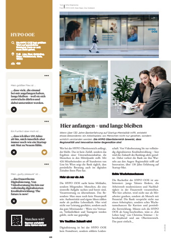 44Wer bei der HYPO Ober%u00f6sterreich anf%u00e4ngt, der bleibt. Das ist kein Zufall, sondern das Ergebnis einer Unternehmenskultur, die Menschen in den Mittelpunkt stellt. Mit 426 Mitarbeitenden an elf Standorten von Linz bis Wien zeigt die Bank t%u00e4glich, dass pers%u00f6nliche Beratung auch im digitalen Zeitalter ihren Platz hat.Mehr als nur ein Job Die HYPO OOE sucht keine Mitl%u00e4ufer, sondern Mitgestalter. Menschen, die eine sinnvolle Aufgabe suchen und bereit sind, Verantwortung zu %u00fcbernehmen. Das Besondere: Man muss noch kein Finanzprofi sein. Authentizit%u00e4t und eigene Ideen z%u00e4hlen mehr als perfekte Lebensl%u00e4ufe. Hier wird nicht nur Leistung gesch%u00e4tzt, sondern auch das gute Miteinander %u2013 Werte wie Vertrauen, Verl%u00e4sslichkeit und Teamgeist werden gelebt, nicht nur gepredigt.Wo Tradition Zukunft wird Digitalisierung ist bei der HYPO OOE kein Fremdwort, sondern erkl%u00e4rte Leidenschaft. Von Videoberatung bis zur vollst%u00e4ndig digitalisierten Kreditabwicklung %u2013 hier wird die Zukunft des Bankings aktiv gestaltet. Dabei verliert die Bank nie ihre Wurzeln aus den Augen: Regionalit%u00e4t trifft auf Innovation, %u00fcber 130 Jahre Erfahrung auf Startup-Mut.Echte Wachstumschancen Die Bucketlist der HYPO OOE ist ambitioniert: junge Talente f%u00f6rdern, die Arbeitswelt modernisieren und Nachhaltigkeit in der Finanzwelt vorantreiben. Wer hier arbeitet, wird nicht nur als Mitarbeiter gesehen, sondern als Mensch mit Potential. Die Bank verspricht nicht nur einen Arbeitsplatz, sondern echte Wachstumschancen f%u00fcr Karriere und pers%u00f6nliche Entwicklung. M%u00fcsste sich die HYPO OOE als Song beschreiben, w%u00e4re es %u201eEin Leben lang%u201c von Christina St%u00fcrmer %u2013 lebensbejahend und aus Ober%u00f6sterreich. Das passt einfach._HYPO OOE Die HYPO OOE legt gr%u00f6%u00dften Wert auf pers%u00f6nliche Beratung. Denn so weit muss Bank gehen.11 (5%u00d7 Linz, Ried, Sch%u00e4rding, Steyr, V%u00f6cklabruck, Wels, Wien) 426Matchen wir?Scannen und gleich deine Karriere starten!Mein gr%u00f6%u00dfter Flex ist %u2026 %u2026 dass viele, die einmal bei mir angefangen haben, lange bleiben %u2013 weil sie sich entwickeln d%u00fcrfen und dabei unterst%u00fctzt werden.Wenn %u00fcber 130 Jahre Bankerfahrung auf Startup-Mentalit%u00e4t trifft, entsteht etwas Besonderes: ein Arbeitsplatz, wo Menschen nicht nur gesehen, sondern wirklich verstanden werden. Die HYPO Ober%u00f6sterreich beweist, dass Regionalit%u00e4t und Innovation keine Gegens%u00e4tze sind.Hier anfangen %u2013 und lange bleiben%u0009 Text%u0009 Zofia WegrzeckaFoto HYPO OOE, Peter Baier, Zoe GoldsteinANZEIGEMein %u201eguilty pleasure%u201c ist %u2026 %u2026 das Dauerthema Digitalisierung. Von Videoberatung bis hin zur vollst%u00e4ndig digitalisierten Kreditabwicklung: The future is now!Ein Funfact %u00fcber mich ist %u2026 %u2026 dass ich %u00fcber 130 Jahre alt bin, mich innerlich aber immer noch wie ein Startup mit Mut zu Neuem f%u00fchle.