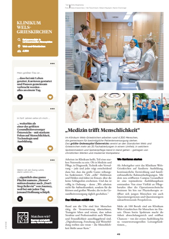 45Arbeiten im Klinikum hei%u00dft, Teil eines starken Netzwerks zu sein. Ob in Medizin und Pflege, in Diagnostik, Technik oder Verwaltung %u2013 jede und jeder tr%u00e4gt entscheidend dazu bei, dass das gro%u00dfe Ganze reibungslos funktioniert. Viele %u201estille%u201c Heldinnen und Helden sind dabei im Einsatz, %u00fcber die keine Schlagzeilen erscheinen. Und das ist v%u00f6llig in Ordnung %u2013 denn: %u201eWir arbeiten nicht f%u00fcr Aufmerksamkeit, sondern f%u00fcr die kleinen und gro%u00dfen Wunder, die in der Gesundheitsversorgung t%u00e4glich geschehen.%u201cDas Klinikum schl%u00e4ft nieRund um die Uhr sind hier Menschen t%u00e4tig, die Verantwortung %u00fcbernehmen, Teamgeist leben und wissen, dass neben Struktur und Professionalit%u00e4t auch W%u00e4rme und Freundlichkeit ausschlaggebend sind. %u201eDigitalisierung, Forschung und Weiterbildung treiben uns voran %u2013 die Menschlichkeit bleibt unser Kern.%u201cWo Karrieren startenAls Arbeitgeber setzt das Klinikum WelsGrieskirchen auf fundierte Ausbildung, kontinuierliche Entwicklung und familienfreundliche Rahmenbedingungen. Mit dem neu er%u00f6ffneten Campus Gesundheit ist eine topmoderne Ausbildungsbasis entstanden: Von einer Vielfalt an Pflegeberufen %u00fcber die Operationstechnische Assistenz bis hin zur Physiotherapie er%u00f6ffnet sich jungen Menschen wie auch Quereinsteigerinnen und Quereinsteigern zukunftsweisende Perspektiven.Mehr als 100 Berufe sind am Klinikum Wels-Grieskirchen f%u00fcr Menschen im Einsatz. Dieses breite Spektrum macht die Arbeit abwechslungsreich und er%u00f6ffnet Chancen %u2013 von der ersten Ausbildung bis zu verantwortungsvollen Leitungsfunktionen._KLINIKUM WELSGRIESKIRCHENSpitzenmedizin in vertrauensvoller Atmosph%u00e4reWels und Grieskirchen 4.300Matchen wir?Scannen und gleich deine Karriere starten!Mein gr%u00f6%u00dfter Flex ist %u2026 %u2026 dass bei mir Leben gerettet, Karrieren gestartet und Pausen gemeinsam verbracht werden %u2013 alles an einem Tag.Im Klinikum Wels-Grieskirchen arbeiten rund 4.300 Menschen, die gemeinsam f%u00fcr bestm%u00f6gliche Patientenversorgung stehen. Das gr%u00f6%u00dfte Ordensspital %u00d6sterreichs vereint an den Standorten Wels und Grieskirchen mehr als 35 Fachabteilungen in einem Umfeld, in welchem Spitzenmedizin und Spitzenpflege Hand in Hand gehen %u2013 getragen von christlichen Werten und moderner Kompetenz.%u201eMedizin trifft Menschlichkeit%u201c%u0009 Text%u0009 Zofia WegrzeckaFoto Wels-Grieskirchen / Nik Fleischmann, Robert Maybach, Marion PrenningerWenn ich ein Song w%u00e4re, dann w%u00e4re ich %u2026%u2026 eigentlich eine ganze Playlist namens %u201eHeroes%u201c %u2013 mitten drunter auch %u201eDon%u2019t Stop Believin%u2018%u201c von Journey, weil bei mir jeden Tag jemand Hoffnung sch%u00f6pft.In f%u00fcnf Jahren sehe ich mich %u2026%u2026 weiterhin als einer der gr%u00f6%u00dften Gesundheitsversorger %u00d6sterreichs %u2013 mit starkem Fokus auf Menschlichkeit, Technologie und Ausbildung.ANZEIGE