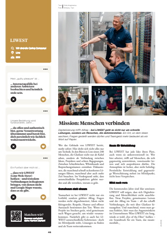 46Wer das Geb%u00e4ude von LIWEST betritt, merkt sofort: Hier dreht sich nicht alles nur um Technik. In den B%u00fcros in Linz sitzen 208 Menschen, die Glasfaser nicht nur als Kabel sehen, sondern als Verbindung zwischen Ideen, Projekten und echten Begegnungen. Zwischen Schreibtischen, Whiteboards und Besprechungsr%u00e4umen entstehen Diskussionen, die manchmal schnell zu konkreten L%u00f6sungen f%u00fchren, manchmal aber auch mehr Zeit brauchen. Im Vordergrund steht, dass unterschiedliche Perspektiven geh%u00f6rt werden und alle verstehen, worum es geht.Gemeinsam statt einsamTeamarbeit ist bei LIWEST nicht nur ein Leitbild, sondern gelebter Alltag. Fragen werden nicht abgeschmettert, Ideen nicht kleingeredet. Respekt, Humor und offener Austausch bestimmen den Ton. Wenn ein Projekt ins Stocken ger%u00e4t, wird gemeinsam nach Wegen gesucht, um wieder voranzukommen. Nat%u00fcrlich gibt es auch bei LIWEST unterschiedliche Sichtweisen - doch im Mittelpunkt steht, L%u00f6sungen zu finden und als Team weiterzukommen.Raum f%u00fcr EntwicklungBei LIWEST hat jede Idee ihren Platz, auch wenn sie unkonventionell ist. Wer hier arbeitet, trifft auf Menschen, die sich gegenseitig unterst%u00fctzen, voneinander lernen und sich ausprobieren d%u00fcrfen. Die Atmosph%u00e4re ist locker, aber nicht beliebig: Pers%u00f6nliche Entwicklung und gegenseitige Wertsch%u00e4tzung stehen im Mittelpunkt, nicht leere Versprechen.Blick nach vornDie kommenden Jahre sind klar umrissen: LIWEST will zeigen, dass sich Digitalisierung und Menschlichkeit nicht ausschlie%u00dfen. Neue Projekte, gemeinsames Lernen und der Alltag im Team %u2013 all das schafft Verbindungen, die weit %u00fcber Glasfaser hinausgehen. Und manchmal, wenn man genau hinh%u00f6rt, h%u00f6rt man das Augenzwinkern im Unternehmen: W%u00e4re LIWEST ein Song, w%u00fcrde er wohl %u201eEye of the Fiber%u201c hei%u00dfen %u2013 ein Soundtrack f%u00fcr ein Team, das zusammenh%u00e4lt._LIWEST Wir sind die Caring Company!Linz 208Matchen wir?Scannen und gleich deine Karriere starten!Mein %u201eguilty pleasure%u201c ist %u2026%u2026 Internetausf%u00e4lle bei anderen Anbietern beobachten und heimlich stolz sein.Digitalisierung trifft Alltag %u2013 bei LIWEST geht es nicht nur um schnelle Leitungen, sondern um Menschen, die dahinterstehen. Ein Ort, an dem Ideen wachsen, Fragen gestellt werden d%u00fcrfen und Teamgeist mehr bedeutet als ein Wort auf Papier.Mission: Menschen verbinden%u0009 Text%u0009 Zofia WegrzeckaFoto Witzany, TranEin Funfact %u00fcber mich ist %u2026%u2026 dass wir LIWEST (Linz-Wels-Steyr) hei%u00dfen %u2013 und trotzdem Verbindungen in Regionen bringen, von denen nicht mal Google Maps wusste, dass es sie gibt.Unsere Beziehung wird funktionieren, wenn %u2026%u2026 du offen und authentisch bist, gerne Verantwortung %u00fcbernimmst und bereit bist, dich pers%u00f6nlich wie fachlich weiterzuentwickeln.ANZEIGE