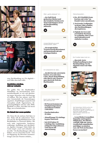 49Unsere Beziehung wird funktionieren, wenn %u2026%u2026 du neugierig bist, Verantwortung %u00fcbernimmst und gemeinsam mit mir L%u00f6sungen fi ndest.Ein Funfact %u00fcber mich ist %u2026... dass jede vierte Onlinebestellung in einer Buchhandlung vor Ortabgeholt wird: weil N%u00e4he z%u00e4hlt.Mein %u201eguilty pleasure%u201c ist %u2026%u2026 der Duft frisch gedruckter B%u00fccher und das heimliche Reinlesen in Neuerscheinungen, bevordie Buchhandlung aufmacht.Ich verspreche dir, dass %u2026%u2026 du dich bei mir entwickeln kannst, sei es mit einer Lehre, durch Weiterbildung oder durch viele Chancen quer durch die Welt des Buchhandels.Meine Bucketlist %u20261. Die %u201eBUCHst%u00e4blich beste Karriere mit Lehre%u201c im Handel weiter auszubauen.2. Noch mehr Treff punkte in deiner N%u00e4he schaff en, also Buchhandlungen, die inspirieren.3. Digitale Services und pers%u00f6nliche Beratung so verbinden, dass Lesen und Einkaufen noch einfacher werden.einer Buchhandlung vor Ort abgeholt %u2013 weil N%u00e4he eben doch z%u00e4hlt.Geschichten schreiben, nicht nur verkaufen Der gr%u00f6%u00dfte Flex des Buchh%u00e4ndlers? Marktf%u00fchrer im %u00f6sterreichischen Sortimentsbuchhandel zu sein und gleichzeitig jungen Menschen echte Karrierewege zu er%u00f6ff nen. Wer hier arbeitet, wird Teil einer Gemeinschaft, die Veranstaltungen organisiert, Empfehlungen ausspricht und Atmosph%u00e4re schaff t. Eigeninitiative, Begeisterungsf%u00e4higkeit und der echte Wille, Buchliebe zu teilen, sind dabei die besten Wege, um zu beeindrucken.Die Zukunft des Lesens gestalten Die Vision f%u00fcr die n%u00e4chsten f%u00fcnf Jahre ist klar: Th alia will die unbestrittene Nummer eins f%u00fcr alle Buchliebhaberinnen und Buchliebhaber in %u00d6sterreich bleiben. Mit noch mehr inspirierenden Standorten, erstklassiger Ausbildung und durchdachten digitalen L%u00f6sungen. Dabei bleibt das Credo simpel: %u201eLesen und einkaufen, wie du willst.%u201c Die Buchhandlungen sollen das bleiben, was sie so besonders macht %u2013 Orte der Begegnung, die Menschen zusammenbringen und zum Tr%u00e4umen einladen._Ab Dezember 2025 suche ich 30 neue Lehrlinge f%u00fcr ganz %u00d6sterreich, deren Ausbildung im Sommer 2026 startet. Warum eine Lehre bei mir Sinn macht %u2026%u2026 Lesen f%u00f6rdert Gesundheit, Empathie und kognitive F%u00e4higkeiten. Wer B%u00fccher verkauft, hilft mit, unsere Gesellschaft empathischer und kl%u00fcger zu machen. Lust, die Welt ein bisschen besser zu machen?ANZEIGENoch mehr Fakten %u00fcber die Lehre bei mir:%u00b7 80 Prozent kommen als Schulumsteiger:innen aus h%u00f6heren Schulen (AHS/BHS)%u00b7 Durchschnittsalter: 20 Jahre%u00b7 Aktuell knapp 70 Lehrlinge in ganz %u00d6sterreich%u00b7 Seit 2022 haben 95 Lehrlinge ihre Ausbildung erfolgreich abgeschlossen. Viele davon mit Auszeichnung.