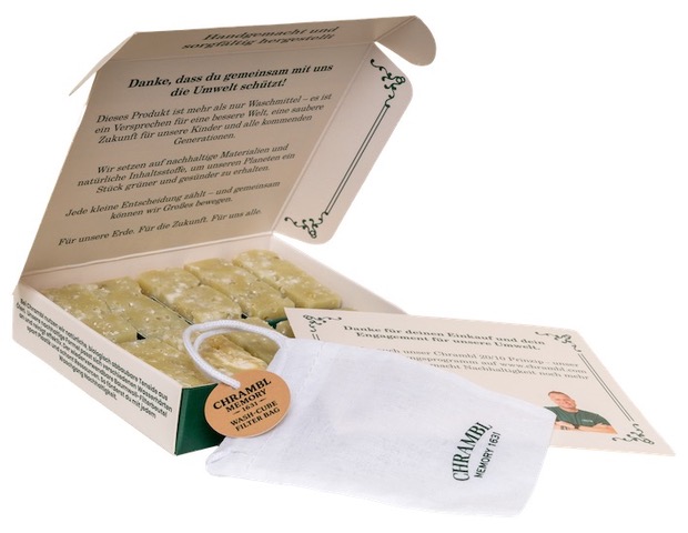 Mit dem Chrambl® Waschwürfel stellt das junge Unternehmen aus Österreich den Einsatz von herkömmlichen Waschmitteln wie Pulver, Tabs, Pods oder flüssigen Produkten auf den Kopf. Stattdessen kommt nur ein kleiner Würfel zum Einsatz. Das feste in Handarbeit und Blockform hergestellte Waschmittel ist ein echter „Alleskönner“. Denn ohne einen Weichspüler zu verwenden, unterstützt der Würfel dennoch die angenehmen Eigenschaften beim Waschen. Auch besonders: der Würfel passt sich an die unterschiedlichen Waschgänge von 30–90 Grad, die verschiedenen Wassermengen und auch an Wasserhärtegrade an. Und dabei dosiert er die benötigte Waschmittelmenge ganz automatisch. Das ermöglicht insgesamt mindestens fünf Waschgänge pro Würfel, bei denen er sich im Laufe der Waschvorgänge nach und nach kontrolliert auflöst. Damit entfällt die sonst mögliche Überdosierung – ein weiteres Plus.