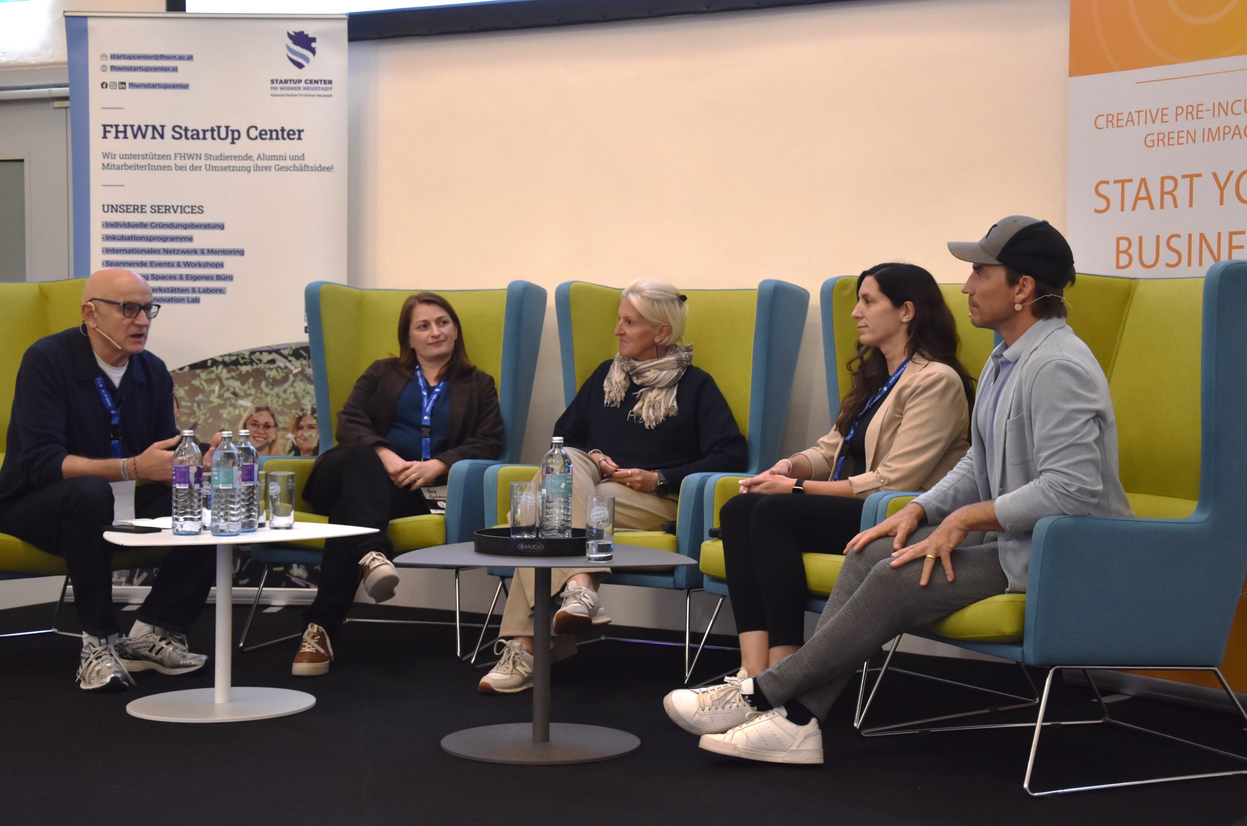 Unter der Leitung von Reinhard Herok, wissenschaftlicher Mitarbeiter der FHWN und Green Marketing-Trainer, vertiefte eine Podiumsdiskussion das Thema „Erfolgreich im Team“. Expertinnen und Experten aus Wirtschaft, Wissenschaft und Gründungspraxis diskutierten, wie erfolgreiche Zusammenarbeit gelingt und welche Rolle Vertrauen, Kommunikation und Vielfalt in Teams spielen.
