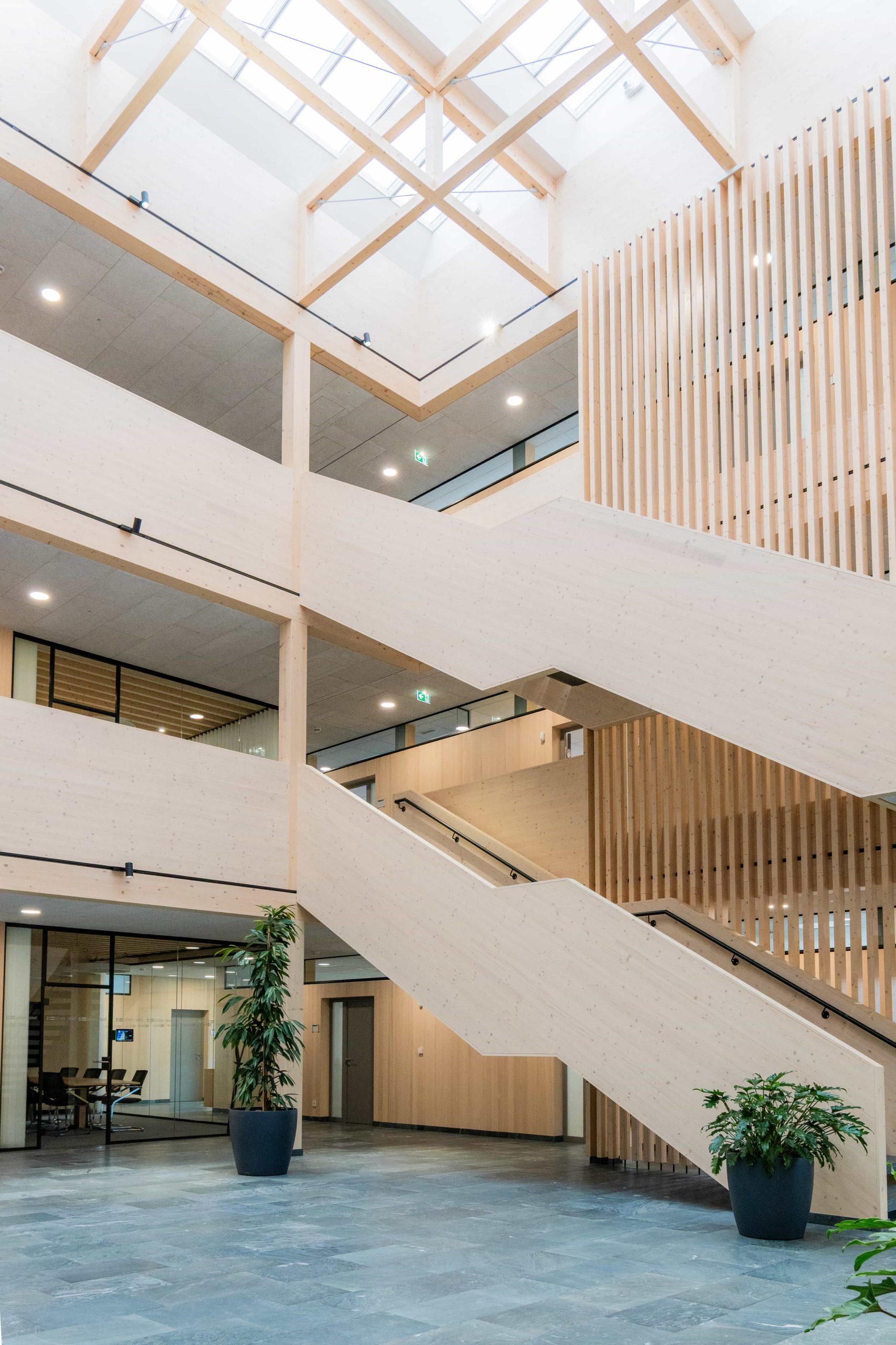 Mit einer Nutzfläche von rund 3.000 m² auf drei Geschoßen, bietet das in Holzhybridbauweise errichtete Bürogebäude Raum für rund 100 Arbeitsplätze, mehrere Besprechungsräume sowie Rückzugsmöglichkeiten in offenen Kommunikationszonen, die u.a. den interdisziplinären Austausch und die Zusammenarbeit fördern. Herzstück des Neubaus ist das lichtdurchflutete Atrium mit einer beeindruckenden Raumhöhe von 12 Metern, welches dank Glasdach und offener Bauweise ein helles, inspirierendes Arbeitsumfeld bietet und als kommunikatives Zentrum für Begegnungen dient. Auch außen zeigt sich der umweltbewusste Leitgedanke: Die Kombination von grünen Fassadenelementen und Holzfassade lässt das Gebäude natürlich und zugleich modern erscheinen. E-Ladestationen sowie großzügige Fahrradabstellplätze im Außenbereich runden den ökologischen Anspruch ab.
