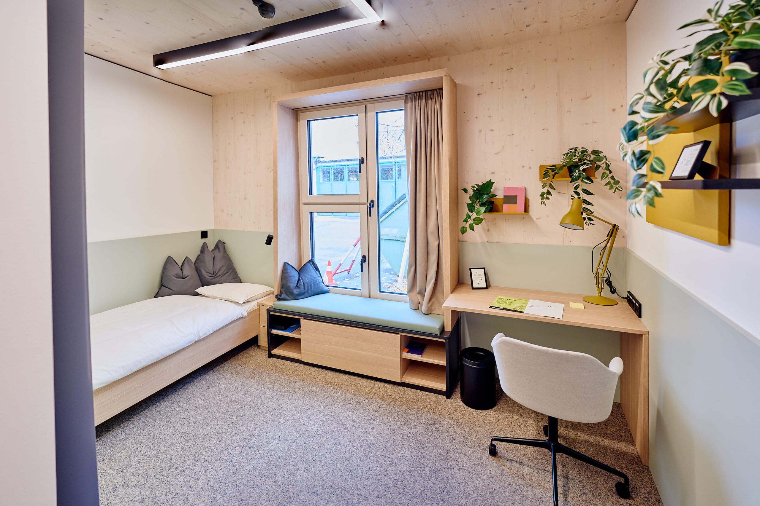 Im Zuge der Planungen wurde auch ein Musterzimmer für das neue Lehrlingswohnheim errichtet. Dieses kann ab November 2025 von den Lehrlingen probebenutzt werden. Änderungswünsche können so frühzeitig berücksichtigt und bei Bedarf Anpassungen vorgenommen werden.