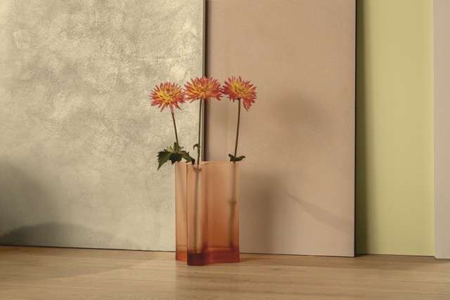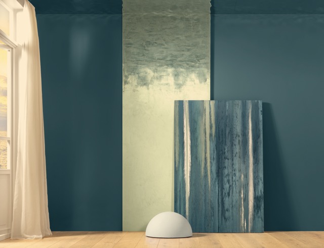 Blau dominiert die Meere und damit auch die Trendfarben 2026. Zu Deep Ocean gesellt sich ein Tafelbild, das die Oberfläche Calcino Romantico Duo in Blau- und Grünnuancen frei interpretiert. Als Begleitung dient hier der satte Lackton Peru 25.
