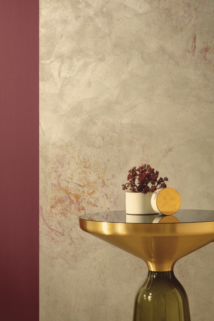 Dass die Trendfarben 2026 die Dualität von Über- und Unterwasser-Perspektiven verbinden, veranschaulicht besonders die Kreativ-Oberfläche des Jahres. „Stucco Eleganza Fusion“ greift wie schon die Oberfläche des Vorjahres auf das vielseitige Standardprodukt Stucco Eleganza zurück. Das Material mit seiner seidig-perlmuttartigen Oberflächenwirkung wird zunächst zweifach per Venezianerkelle im Farbton des Jahres vollflächig aufgespachtelt. Nach der Trocknung appliziert man – wiederum mit der Kelle – kreisförmig die metallisch pigmentierte und mit Quarzkörnchen angereicherte Metallocryl-Dispersion. Gerade der Quarzzuschlag ist für die Gesamtwirkung elementar, denn diese Quarzteilchen mit ihrer rauen Haptik und Optik ergänzen die Tiefe des Blaus, die seidige Basisfläche und die illustren Pigment-Reflexe mit einem gänzlich anderen, mineralisch-substanziellen Effekt. Die Helligkeiten der beiden Farbnuancen unterscheiden sich übrigens nur marginal. Reflexe, Tiefe, Strömungen und scheinbar fließende Partikel stehen assoziativ für den Ozean. Dass bei der Entwicklung über die Ästhetik hinausgedacht wird, versteht sich von selbst: Die Oberfläche des Jahres ist sowohl rationell sowie sicher handwerklich umsetzbar.