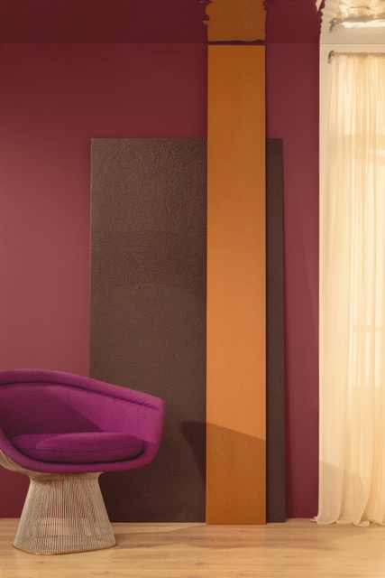 Einem ganz anderen Ansatz folgt wiederum die Farbwelt 3. Ihr Schwerpunkt liegt auf dunklen, intensiven Tönen aus dem Rotbereich – von verhülltem Orangerot bis zu einem elektrisierend-intensiven Bordeauxrot. Das kräftige Spektrum der Farbwelt 3 ergänzt der Lackton Laser 25 mit seiner leuchtend-reinen Anmutung – die Farbe des Jahres fließt erneut als komplementäre Note ein.