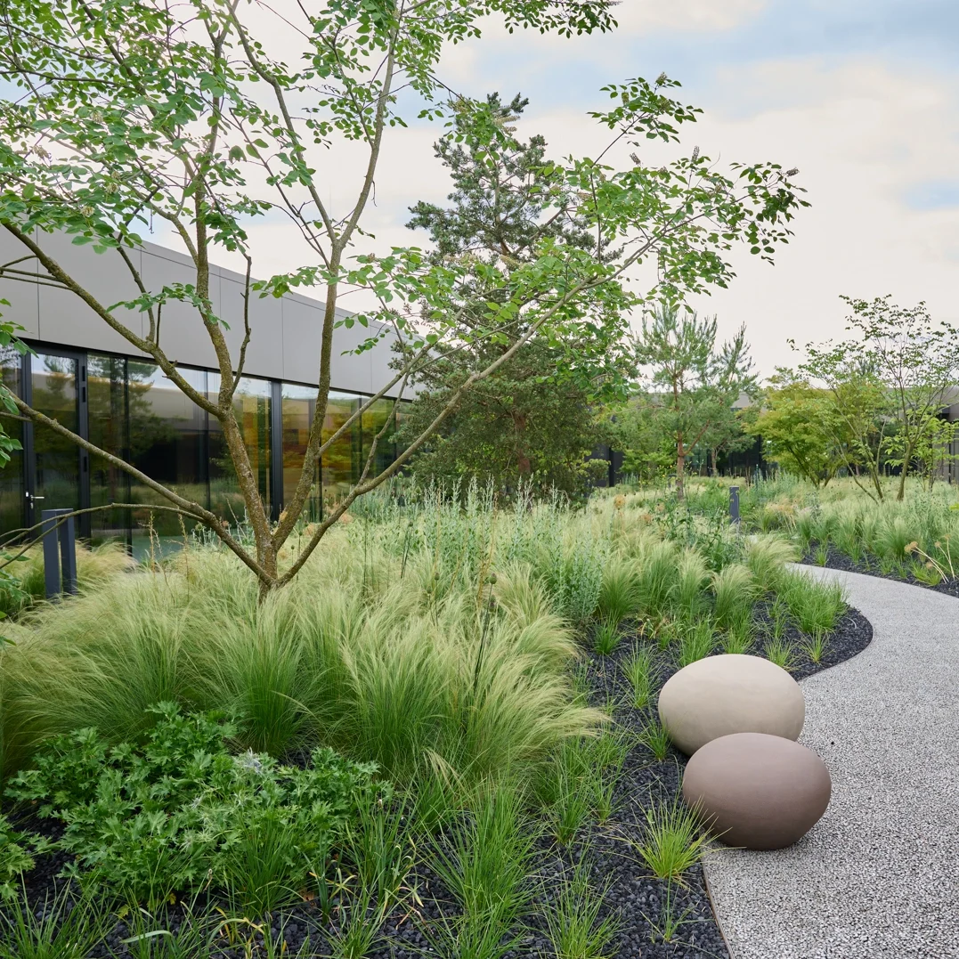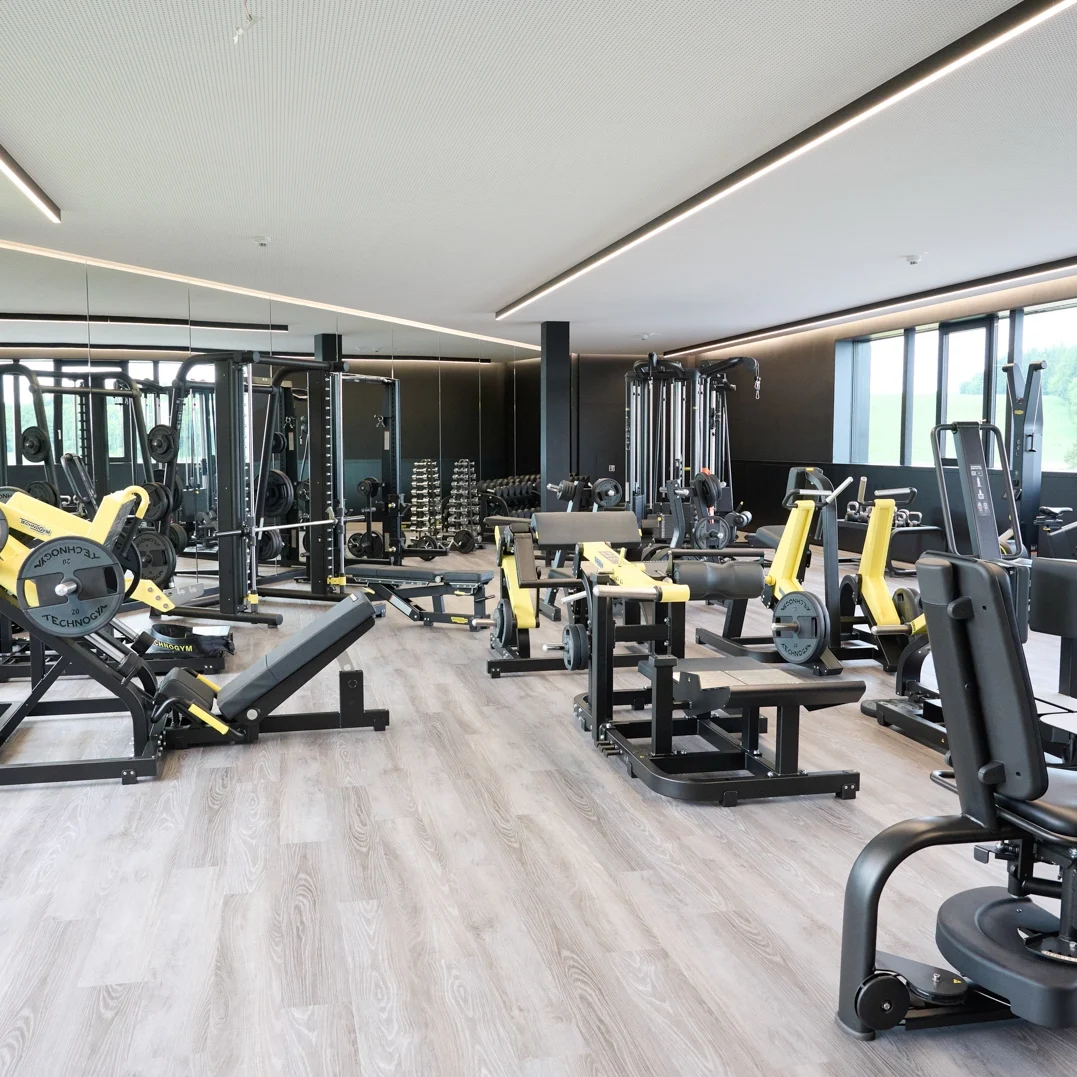 Bei einer Führung durch die oberste Ebene können wir uns gleich selbst überzeugen. Wir nehmen den Lift, treten durch eine Tür und stehen auf einmal mitten auf einer 1.000 Quadratmeter großen Dachterrasse. Unzählige Gräser und hohe Bäume, violette und blaue Blumen säumen die mit Kieselsteinen ausgelegten Pflanzflächen und unser Blick schweift über die Region. Kaum zu glauben, aber wir befinden uns in 20 Metern Höhe. Für 60 Mitarbeitende, die die neu geschaffenen Arbeitsflächen im selben Stockwerk bereits nutzen, bietet die Dachterrasse eine sonnige Fläche für Pausen im Grünen – „und für die eine oder andere Firmenfeier“, sagt Andreas Fill und lacht. Apropos Feier: Dass das geplante Lokal für unterschiedlichste Events genutzt werden kann, ist nicht nur für die Menschen in Gurten und Umgebung ein großes Plus. Die Idee entstand aus einem gewissen Eigennutz, verrät uns Andreas Fill, da es im Ort wenig Möglichkeiten zum Ausgehen gibt. Warum also nicht für die Mitarbeitenden und die Menschen aus der Region ein neues Gastroerlebnis schaffen, von dem alle profitieren? Auch die Kosmetik- und Physiotherapieangebote sind für externe Personen zugänglich. Der Yoga- sowie der Fitnessraum stehen wiederum den Mitarbeitenden und ihren Partnerinnen und Partnern rund um die Uhr zur Verfügung.
