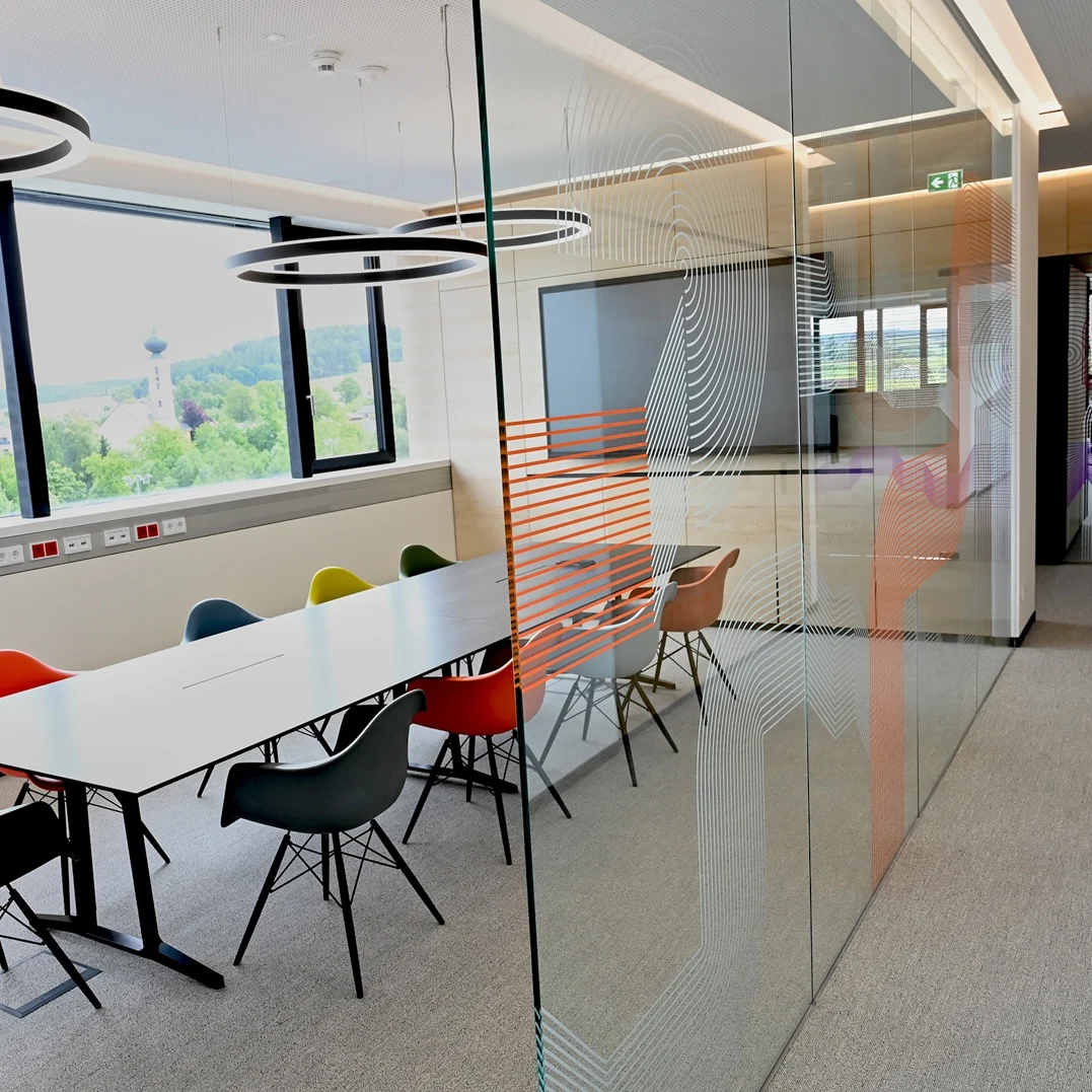 Der gestalterische Anspruch von Andreas Fill und seinem Architekten ist es, zeitlos zu bauen. Mit einem Design, das sich nicht in ein Jahrzehnt einordnen lässt; das hochwertig ist, aber ohne zu protzen. „Es soll schlicht sein, aber trotzdem auf seine Art und Weise spektakulär.“ Die großen Fensterfronten in den neuen Büros zieren bunte Grafiken, die sich auch auf der Mitarbeiterkarte wiederfinden, entworfen von Andreas’ Bruder. Sie haben einen Wiedererkennungswert und bringen Farbe in die Gänge.
